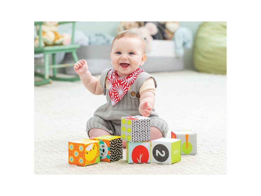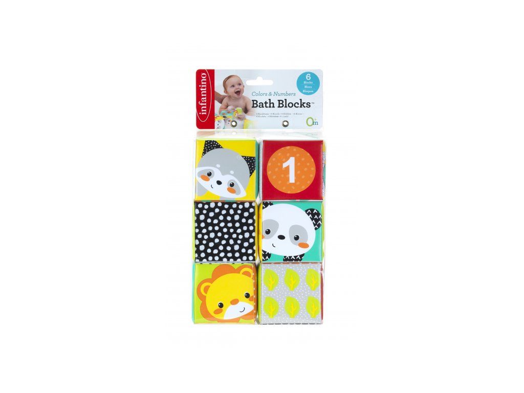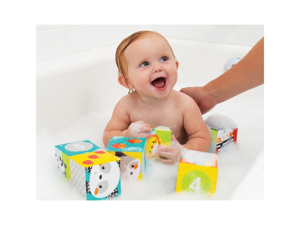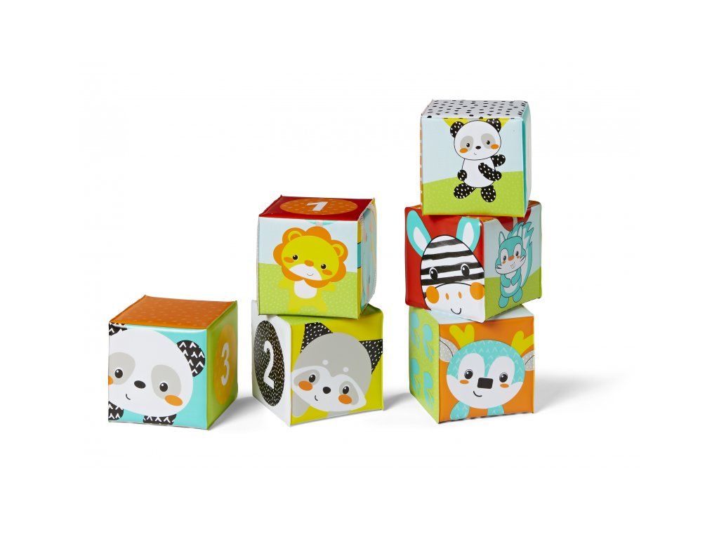 Umývateľné kocky s krásnymi ilustráciami zvieratiek vo výrazných kontrastných farbách sú vhodné pre použitie vo vani aj ako prvé kocky na stavanie veží a spoločné rozprávanie o zvieratkách, farbách i číslach.