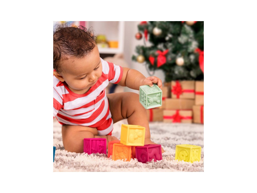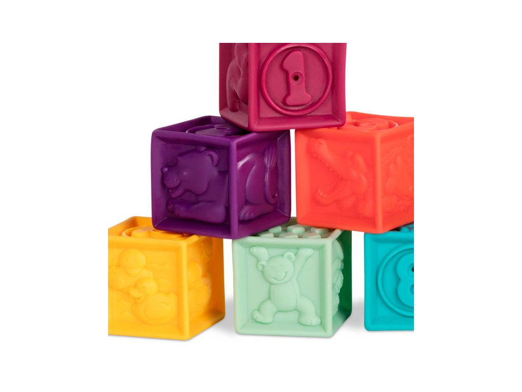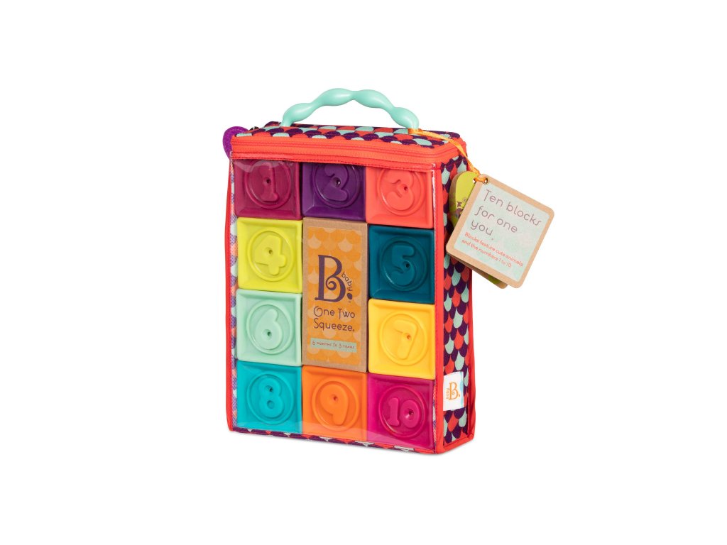 Kocky One Two Squeeze od Btoys vhodné pre deti od 6 mesiacov do 3 rokov. 10 rôznofarebných kociek s písmenami a zvieratami. Mäkký plastový materiál, po stlačení pískajú. Dieťa si s kockami môže hádzať, stavať z nich, učiť sa písmenká a názvy zvieratiek. V darčekovej taške na zips s držadlom do ruky pre ľahké upratovanie aj prenášanie. Taška textilného vzhľadu je vyrobená z recyklovaného polypropylénu. Taška môže byť používaná aj na iné hračky, maľovacie potreby a pod., Ideálna na cesty s dieťaťom. Ak sa tašky chcete zbaviť, jednoducho odstrihnite zips a vinylovú prednú stranu, PP "textília" je nielen recyklovateľná, ale aj biologicky odbúrateľný.
