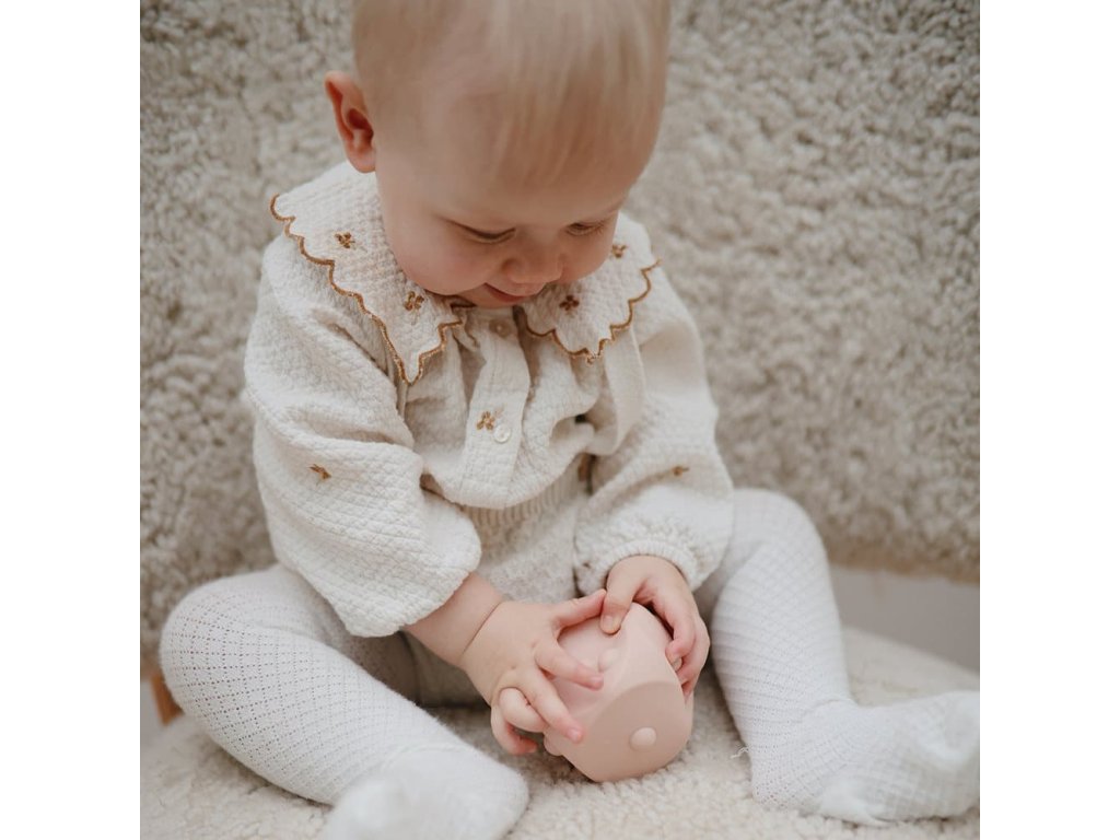 Hračka na stláčanie bodiek na kocke je zábavná zmyslová hračka, ktorá spája učenie a hru. Hračka obsahuje bodky, ktoré sa dajú stláčať a vyskakovať. To podporuje rozvoj jemnej motoriky a zároveň poskytuje nástroj na výučbu počítania a jednoduchého aritmetika. Je vyrobený z potravinárskeho silikónu v jemných farbách a jednoduchom dizajne.