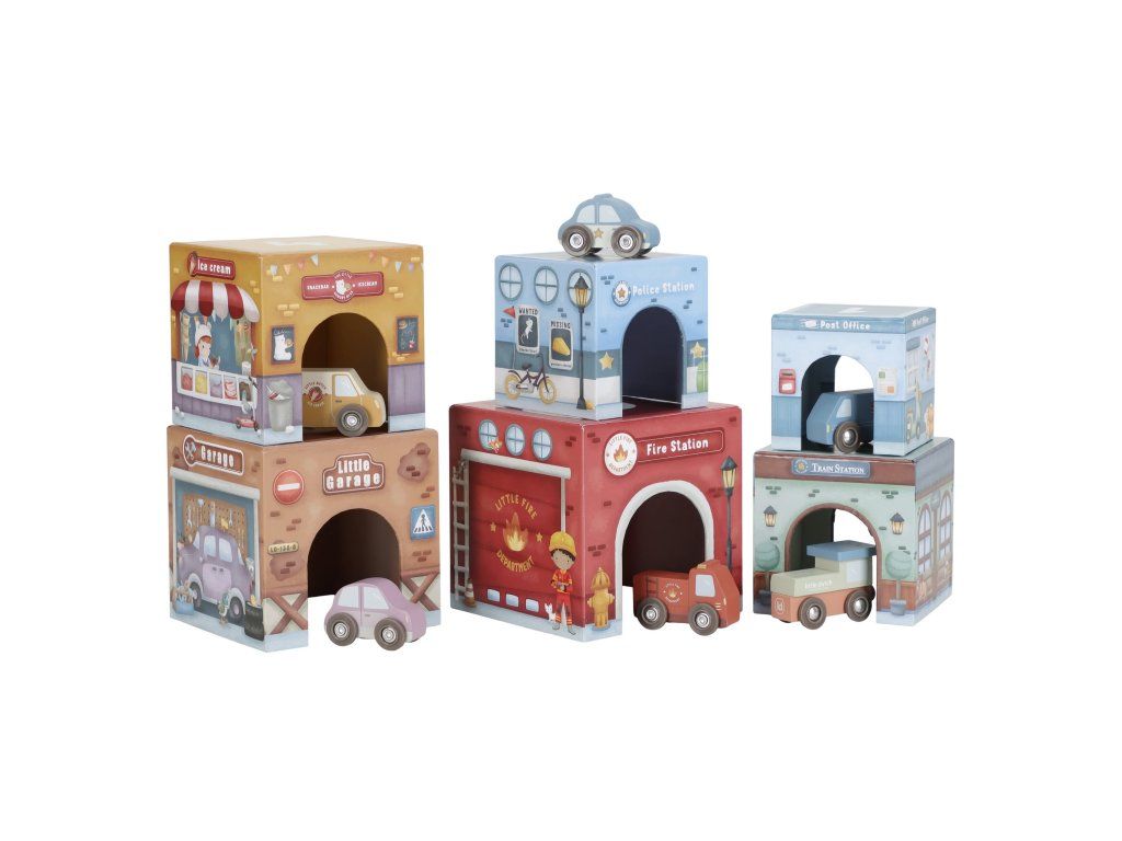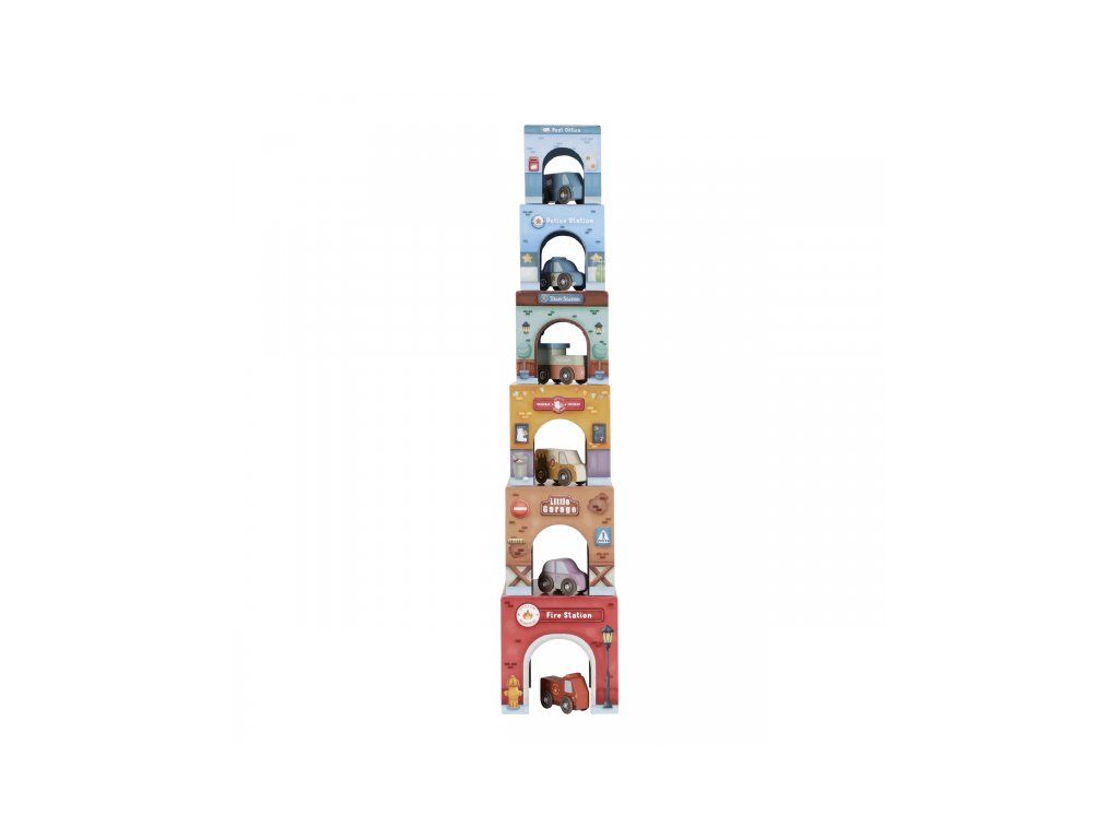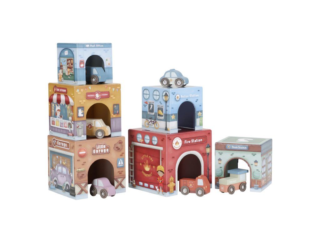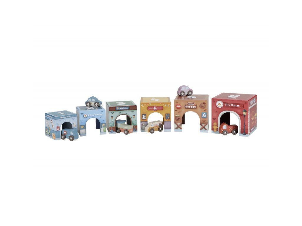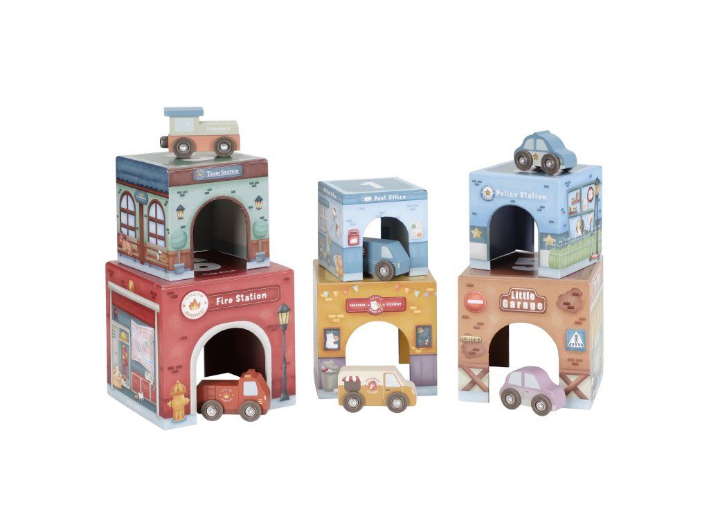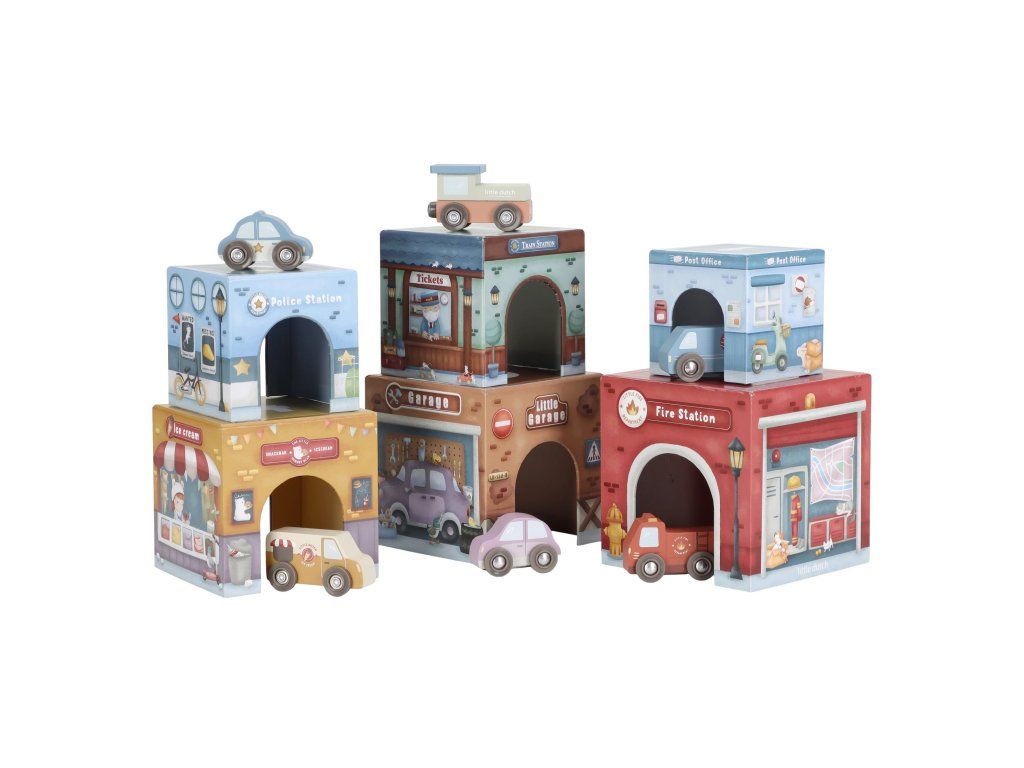 Stavať, objavovať a hrať sa! Táto nápaditá sada Little Duch obsahuje šesť ilustrovaných kartónových kociek rôznych veľkostí, ktoré predstavujú budovy ako požiarnu stanicu, garáž alebo poštu - ak nim 6 drevených vozidiel, patriacich k jednotlivým budovám.