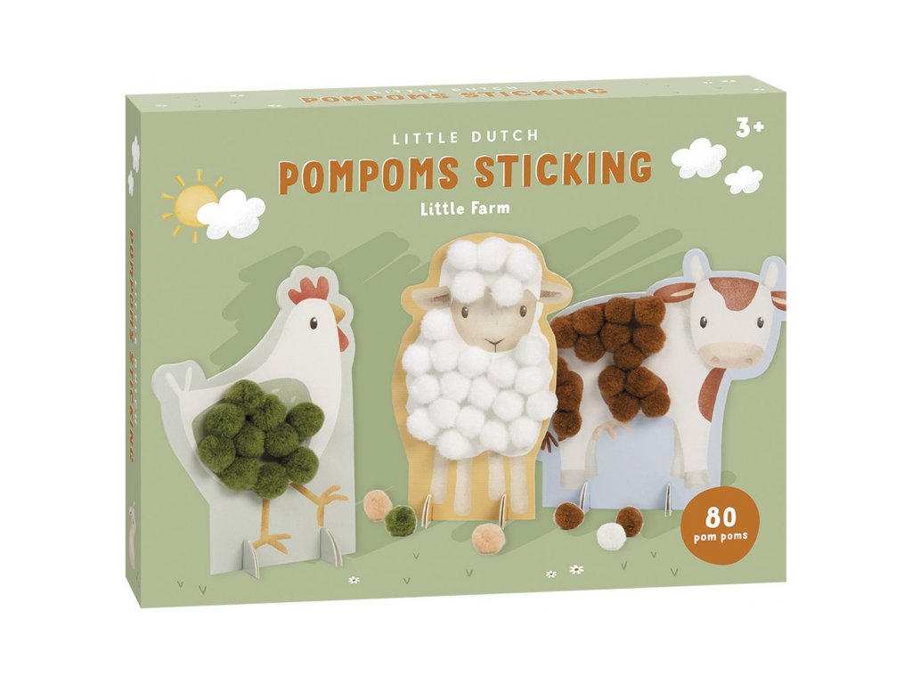 Originálna sada obsahuje 80 brmbolcov v rôznych farbách a štyri kartičky v podobe sliepočky, kravičky, ovečky a prasiatka. Kartičky majú samolepiaci povrch, na ktoré dieťa lepí brmbolce v správnych farbách. Po dokončení zvieratka vďaka stojanu samostatne stojí a môžete ich využiť ako krásnu dekoráciu v detskej izbe.