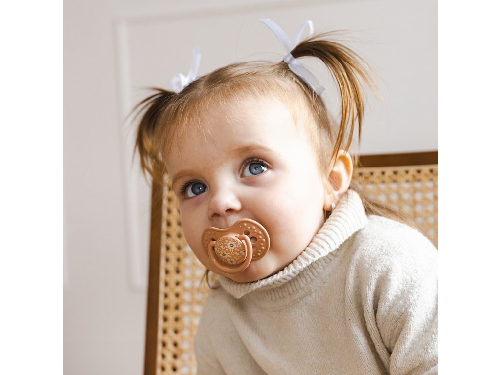 - Silikónová špička cumlíka je zosilnená a tým odolnejšia proti hryzeniu. Praktické v období intenzívneho vývoja zubov a ďasien.