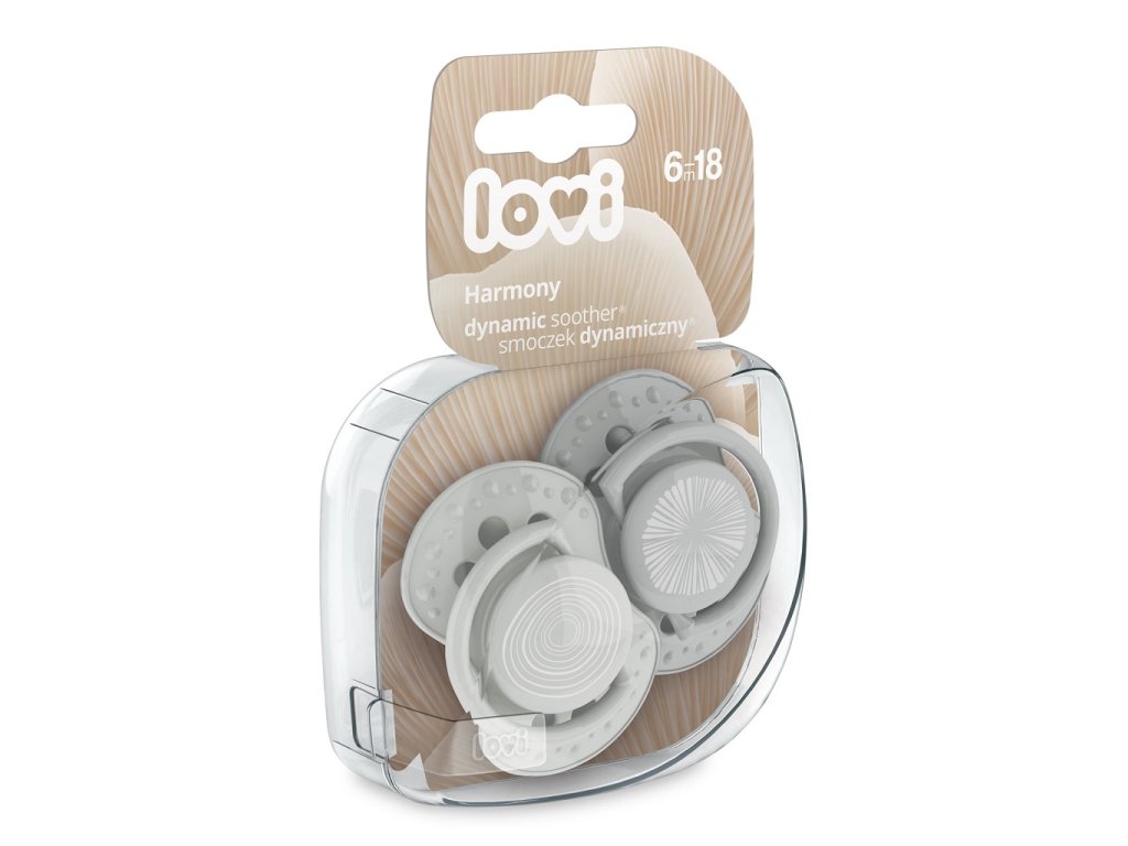 Silikónový dynamický cumlík LOVI® navrhnutý s pomocou neurologopedov. Jedinečný dizajn: heterogénny silikón a symetrický tvar inšpirovaný bradavkou. Nenarušuje sací reflex a prirodzený vývoj reči a zhryzu dieťaťa. Neobvyklý dizajn a farby cumlíka podčiarkujú jedinečnosť kolekcie Harmony.