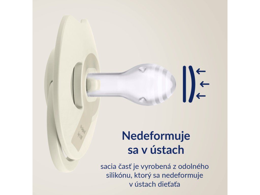 Sploštená sacia časť umožňujú dieťaťu voľne zavrieť ústa a správne pracovať ďasnami.