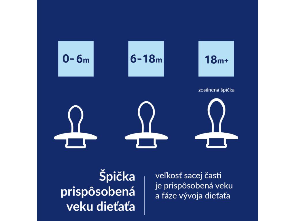 Veľkosť sacej časti je prispôsobená veku a fáze vývoja dieťaťa, líši sa od veľkostí sacích častí u štandardných cumlíkov LOVI.