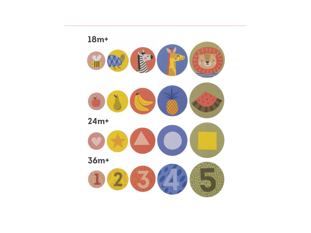 - od 36 mesiacov: Na hranie použite kartičky s číslami a tvarmi, dieťa sa pri ich odkrývaní bude zábavnou formou učiť poznávať farby, veľkosti, názvy geometrických tvarov a neskôr aj číslice.