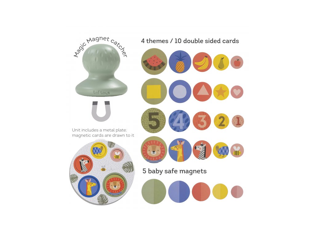 Originálnu magnetickú hru tvorí hracia podložka, ilustrované okrúhle kartičky, magnetické okrúhle kartičky a magnetický chytač. Hra je ideálna pre spoločné hranie dieťaťa s rodičmi, prinesie vám veľa spoločnej zábavy a zároveň vám umožní učiť dieťa zábavnou formou rozpoznávať zvieratká, farby, tvary aj čísla.