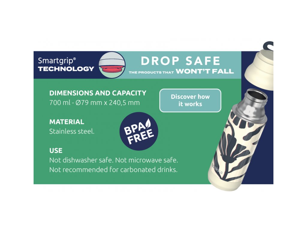 Quokka Pulse je súčasťou kolekcie fliaš a hrnčekov Drop Safe so špeciálnym dnom Smartgrip®, ktoré pri postavení na hladký povrch bránia prevrhnutiu a nechcenému vyliatiu obsahu fľaše.