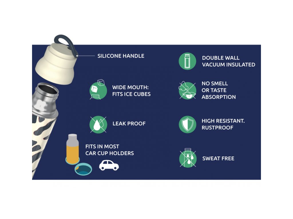 Termoska Quokka Pulse z vysoko kvalitnej dvojstennej ocele so spoľahlivým, 100% tesniacim uzáverom udrží váš nápoj podľa potreby teplý alebo studený. Široké hrdlo umožňuje vloženie kociek ľadu. Termoska udrží teplotu studeného nápoja s ľadom až 48 hodín, studeného nápoja až 16 hodín a teplého nápoja až 12 hodín. Silikónové pútko, ktoré je zakomponované do viečka fľaše, uľahčuje prenášanie.