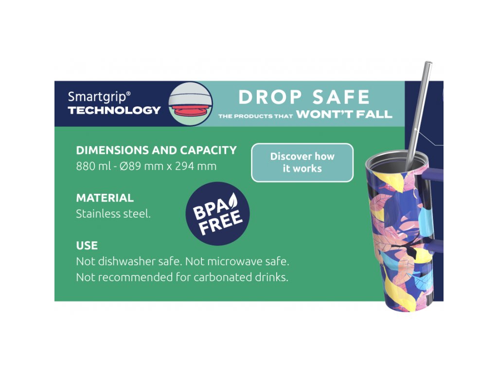 Quokka Vibe je súčasťou kolekcie hrnčekov Drop Safe so špeciálnym dnom Smartgrip®, ktoré pri postavení na hladký povrch bránia prevrhnutiu a nechcenému vyliatiu obsahu hrnčeka.