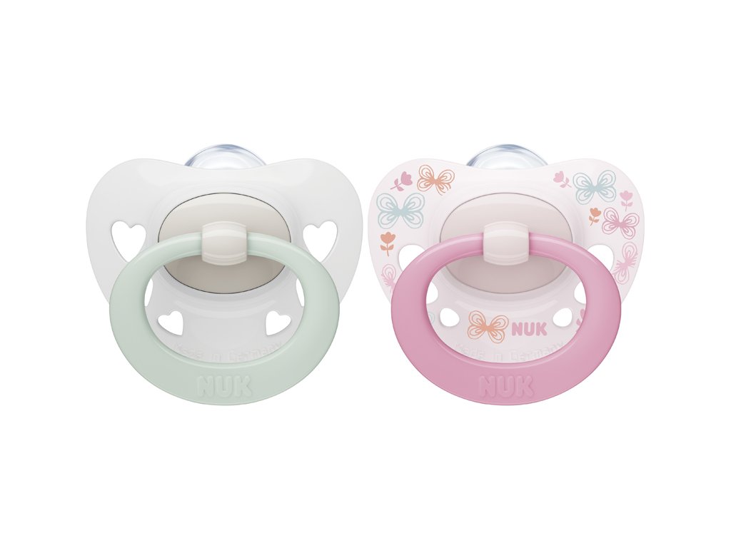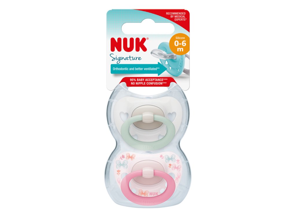 Silikónový cumlík Signature značky NUK je určený pre deti od narodenia do 6 mesiacov. Špeciálny tvar s ortodontickým cumlíkom Classic prispievajú k správnemu vývoju čeľuste. Cumlíky NUK rada Signature reaguje na potrebu prirodzenosti svojím úplne prirodzeným tvarom.