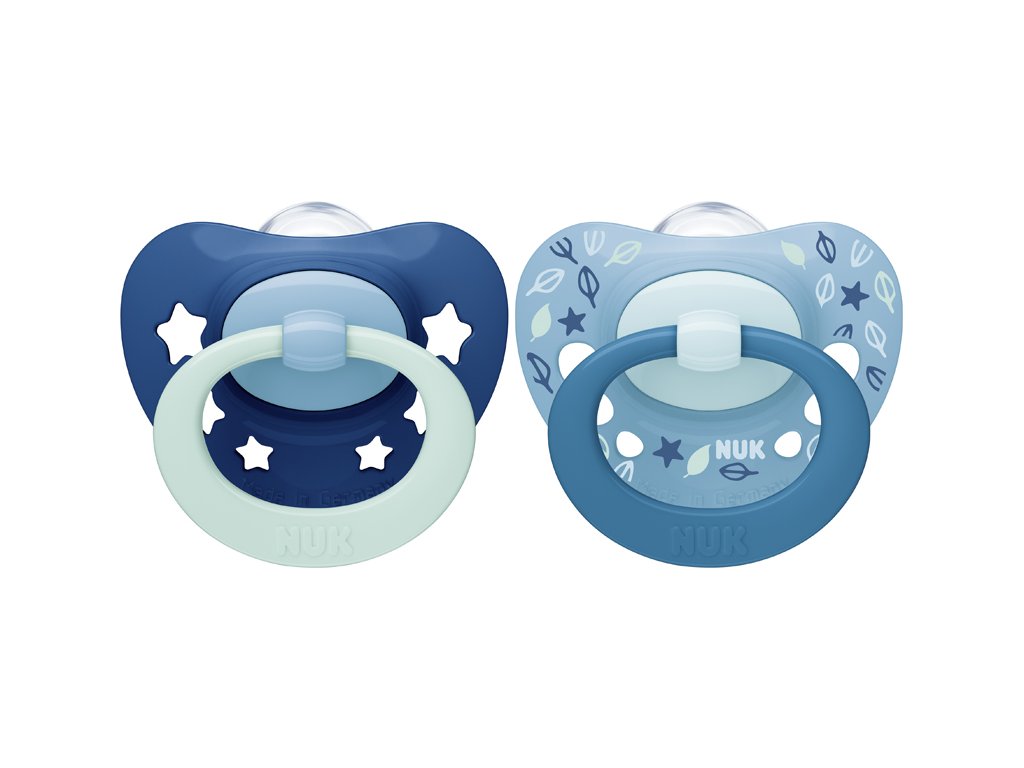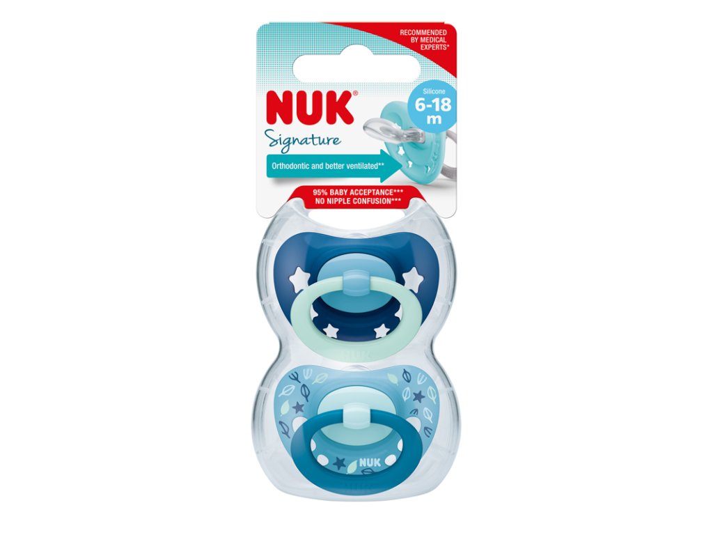 Silikónový cumlík Signature značky NUK je určený pre deti od narodenia do 6 mesiacov. Špeciálny tvar s ortodontickým cumlíkom Classic prispieva k správnemu vývoju čeľuste. Cumlíky NUK rada Signature reaguje na potrebu prirodzenosti svojím úplne prirodzeným tvarom.