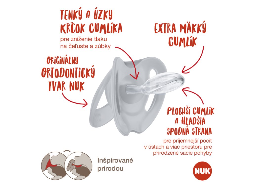 - Originálny tvar NUK (okrúhly hore a plochý dole) ponecháva v ústach priestor pre prirodzené sacie pohyby.