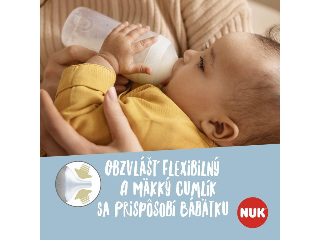 Uchovávajte v suchu a hygienicky. Pri čistení používajte umývací prostriedok NUK alebo jemný prostriedok na ručné umývanie a zvyšky potravín odstráňte tiež zo skrytých oblastí. Ak je to potrebné, výrobok namočte, v žiadnom prípade neškriabte vnútro fľaše. Dôkladne prepláchnite. Cumlíky a fľaše nepatria do umývačky – hrozí poškodenie materiálu pôsobením čistiacich prostriedkov pre umývačky! Niektoré potraviny môžu spôsobiť zafarbenie materiálu (napr. mrkvová šťava) alebo spôsobiť zápach (napr. feniklový čaj). To neobmedzuje vhodnosť