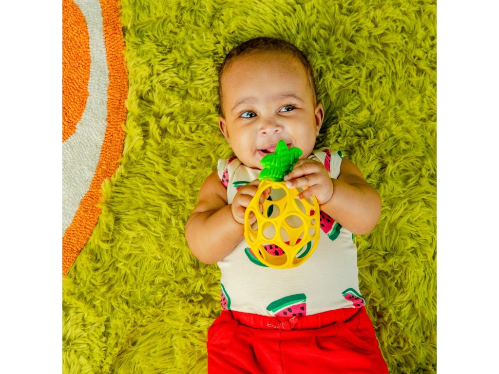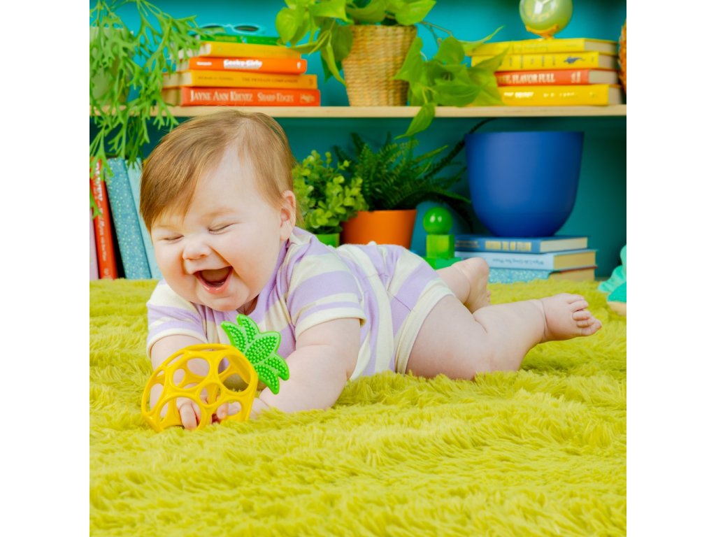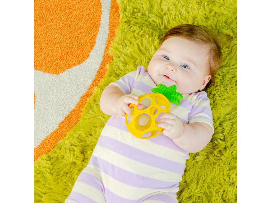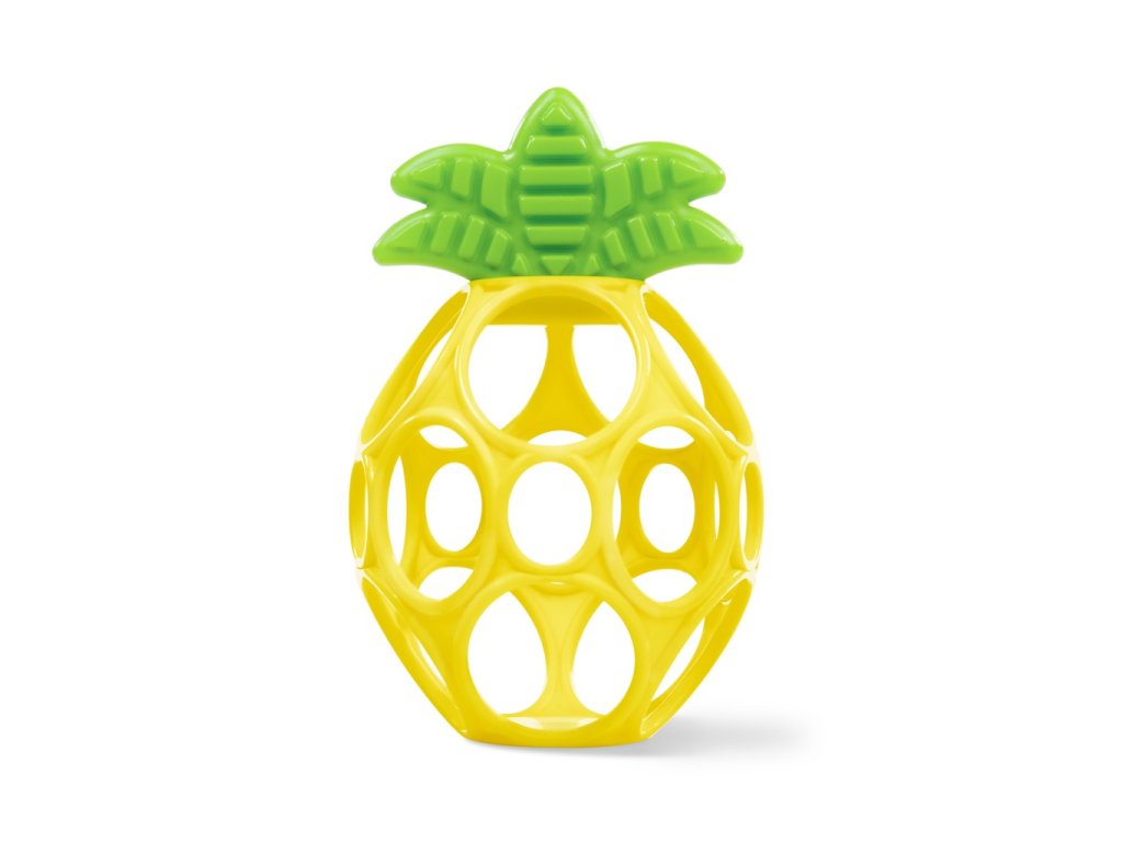 - Ľahko uchopiteľné ananásové hryzátko vyrobené z flexibilnej a odolnej technológie Oball od Bright Starts má otvory na prsty pre malé ručičky na držanie a hranie.