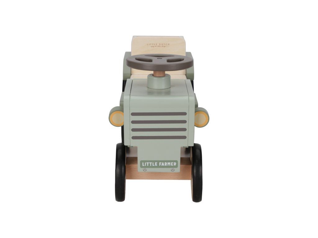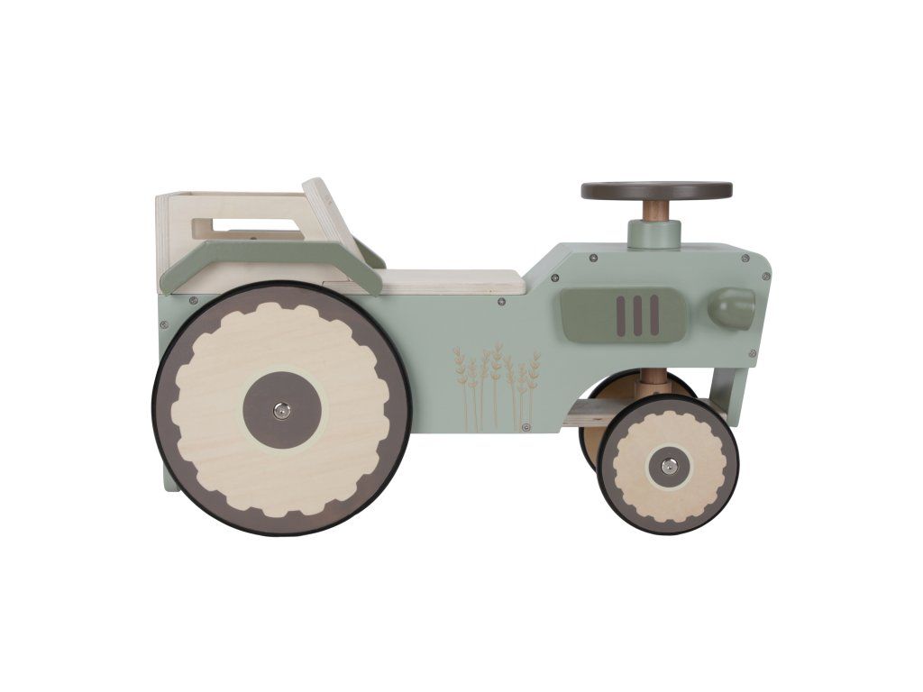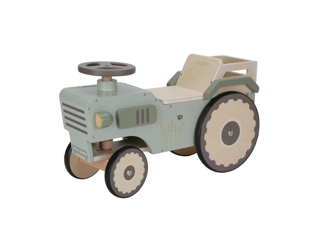 Detské odrážadlo v originálnom drevenom prevedení v podobe traktora s pohodlným sedadlom a volantom na držanie. Priehradka za sedadlom umožňuje povoziť na traktore aj obľúbeného plyšáka či bábiku alebo odviezť náklad kociek. Gumové prúžky na kolesách chránia podlahu pred poškriabaním.