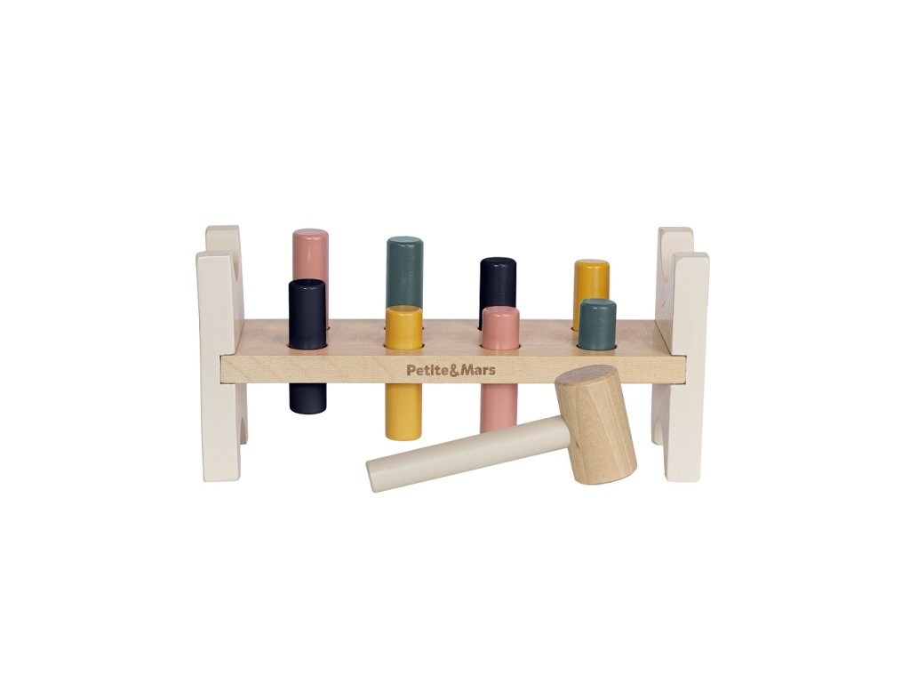 Pomocou 8 drevených kolíkov (4 farebné páry) a kladivka sa dieťa môže hrať a rozvíjať manuálne zručnosti, ako aj rozvíjať svoje znalosti farieb. Mechanizmus zatĺkania kolíkov kladivkom poskytuje fascinujúcu interakciu a rozvíja koordináciu ruka-oko. Pochopením fungovania mechanizmu sa dieťatko učí vzťahom príčiny a následku a logickému mysleniu.