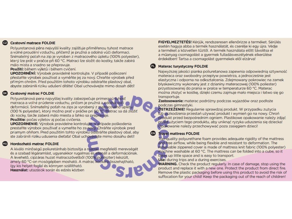 Snímateľný poťah na zips je vyrobený z matracovej pleteniny, ktorú možno prať v práčke pri teplote 60 ̊C. Matrac sa dá zložiť do kocky, takže zaberá málo miesta a ľahko sa prenáša. Súčasťou balenia je taška na prenášanie s praktickou rukoväťou, vďaka ktorej sa matrac aj ľahko skladuje.