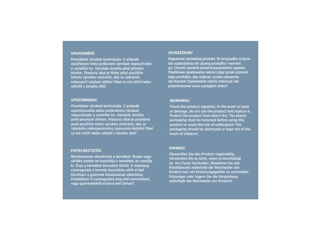 UPOZORNENIE! Pravidelne výrobok kontrolujte. V prípade opotrebovania alebo poškodenia výrobok nepoužívajte a vymeňte ho. Výrobok chráňte pred priamym ohňom. Plastový obal je potrebné pred použitím tohto výrobku odstrániť, aby sa zabránilo nebezpečenstvu zadusenia dieťaťa! Obal sa má zničiť alebo odložiť z dosahu detí!