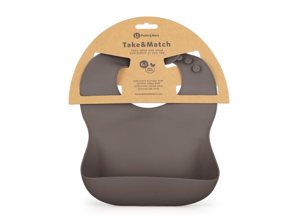 PETITE&MARS Podbradník silikónový Take&Match Bitter Cocoa 6m+