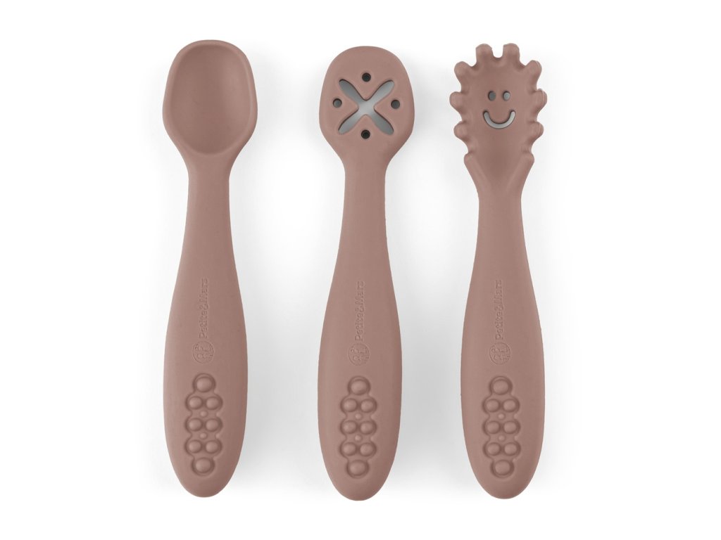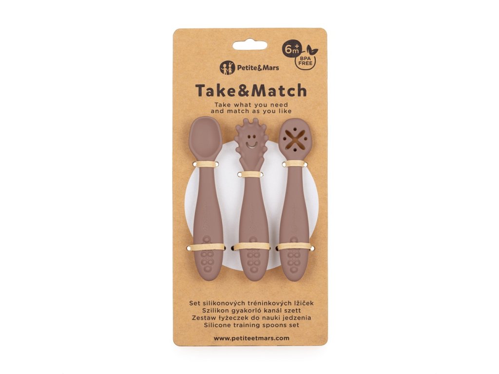 PETITE&MARS Set 3 ks silikónových tréningových lyžičiek Take&Match Bitter Cocoa 6m+
