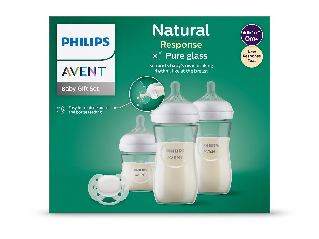 Sklenená darčeková súprava pre novorodenca Natural Response obsahuje 3 sklené fľaše a cumlík ultrasoft.