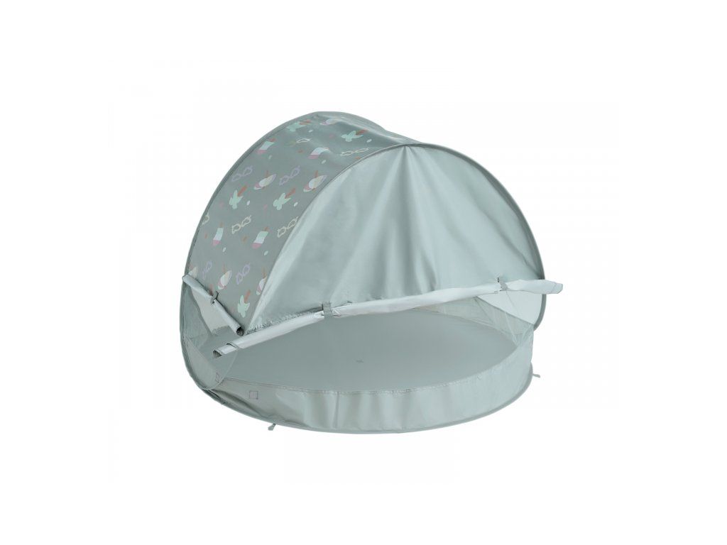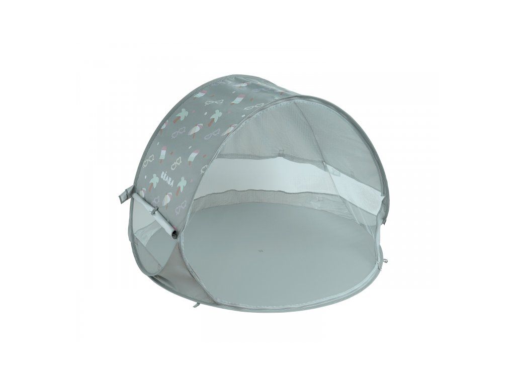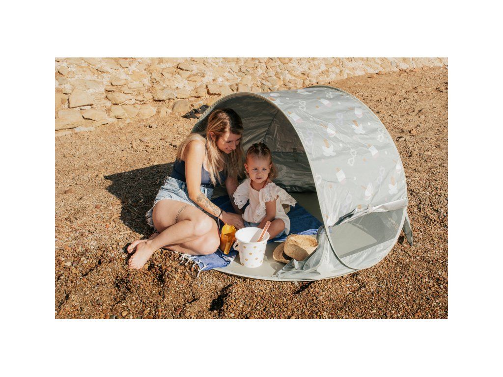 Prenosný univerzálny stan s UV faktorom 50+ na ochranu dieťaťa pred slnkom na záhrade, na pláži či na výletoch do prírody. Stan umožňuje ľahkú ventiláciu vďaka bočným otvorom so sieťovinou a textilnými chlopňami, ktoré je možné zrolovať. Sieťovina chráni dieťa v stane pred ťažkým hmyzom.