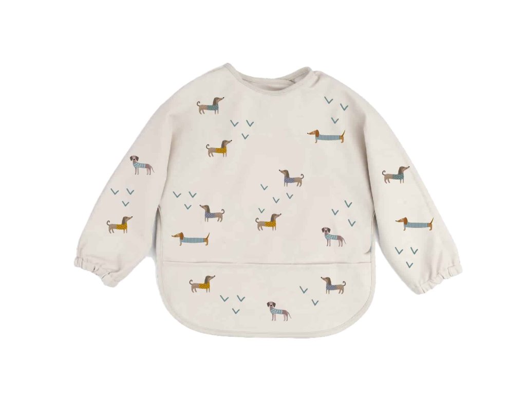 Nepremokavý podbradník s dlhými rukávmi a vreckom na zachytávanie jedla.