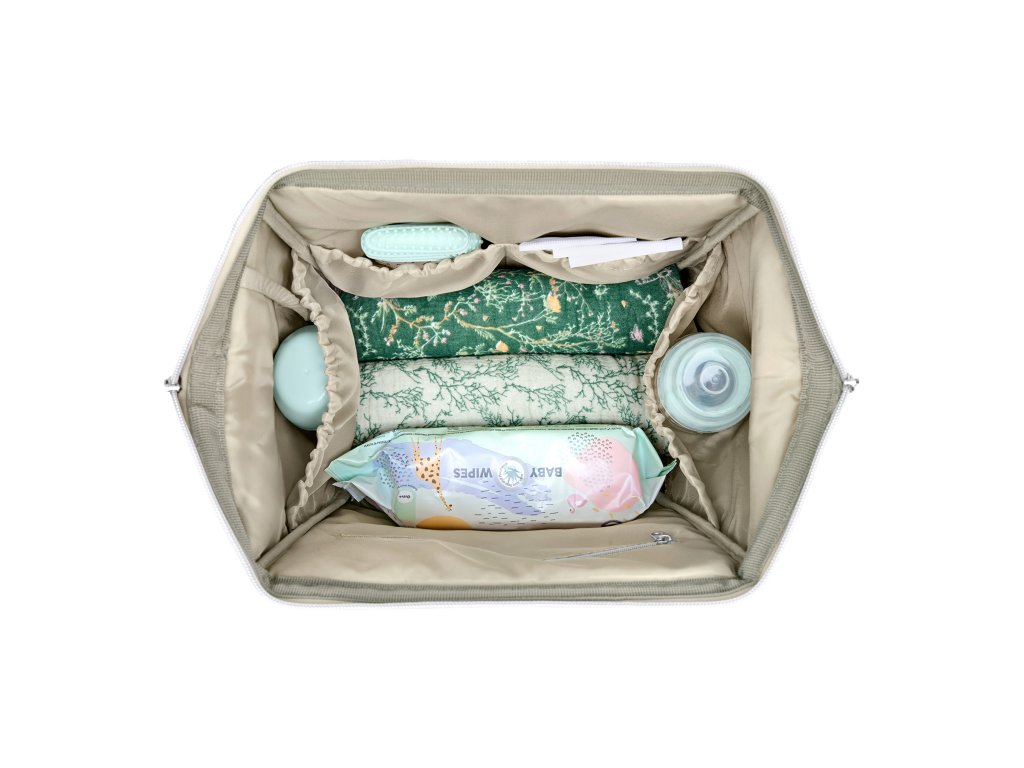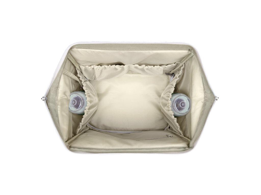 Vnútri batohu nájdete množstvo vreciek a priehradok aj vodeodolné vrecko na uloženie vlhkých predmetov. Široký spôsob otvárania batohu uľahčuje orientáciu v uloženom obsahu. Na vonkajšej strane nájdete vrecká s uzatváraním na zips aj vrecko na uloženie fľaše. Termoizolačné vrecká na fľaše pomáhajú udržať nápoje či mlieko dlhšiu dobu v optimálnej teplote. Súčasťou batoha je aj prebaľovacia podložka.