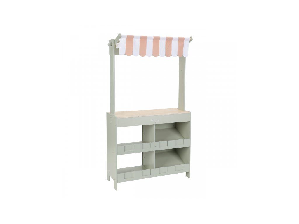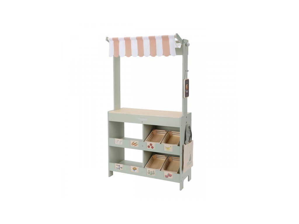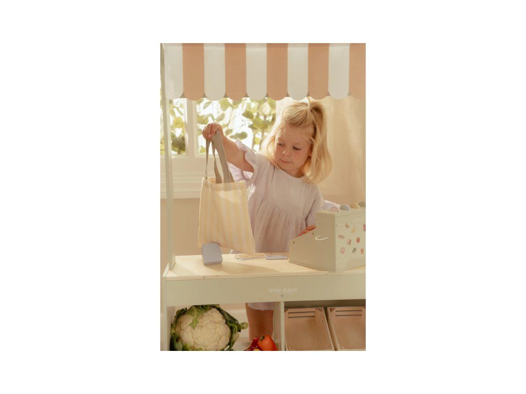 Krásne spracovaný predajný stánok Little Dutch je skvelý základ pre obľúbenú hru na obchod, pri ktorej sa fantázii medze nekladú! Deti si môžu zahrať na predavača čerstvej zeleniny a ovocia alebo obsluhovať hostí vo svojej vlastnej cukrárni plnej sladkých dobrôt.Vďaka šikovnému obojstrannému dizajnu sa farmársky stánok ľahko premení na štýlovú kaviareň. Na jednej strane nájdete predajný pult, pruhovanú markízu, textilnú nákupnú tašku a dostatok miesta na vystavenie tovaru vrátane štyroch debničiek na ovocie a zeleninu. Po otočení stánku sa otvorí kaviarenská časť s ilustrovaným menu a štyrmi výstavnými priehradkami na zákusky.