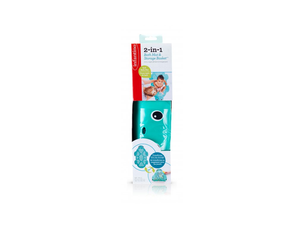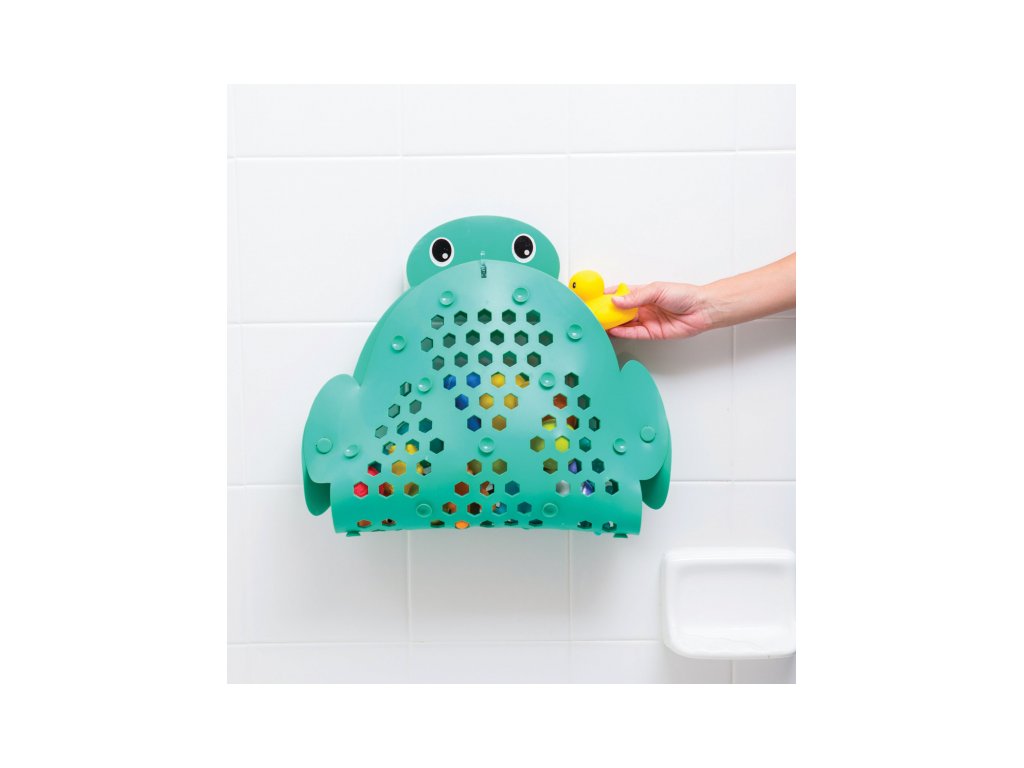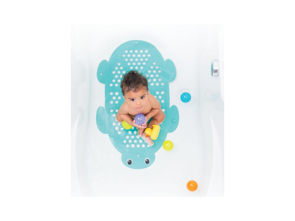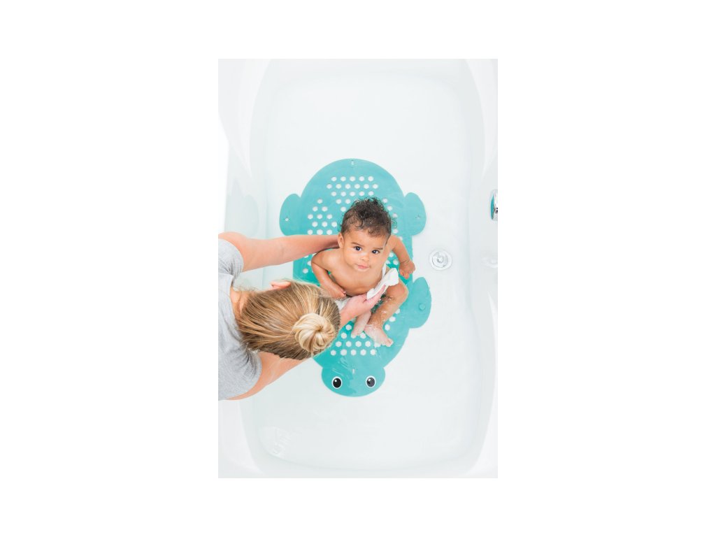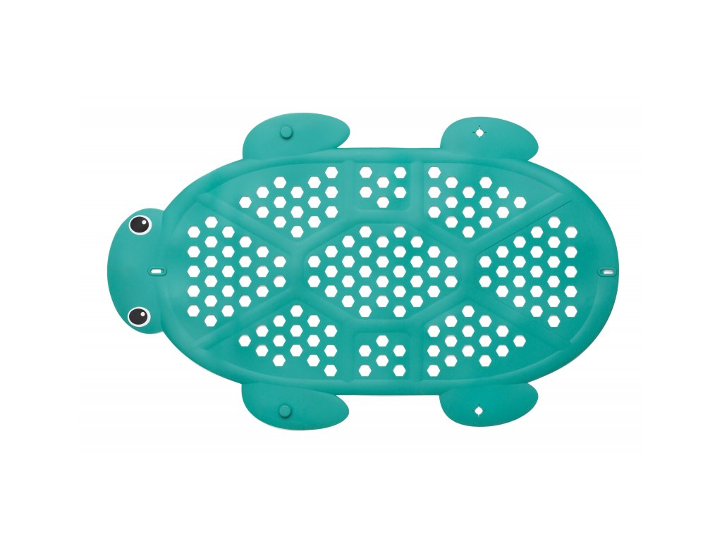 Protišmyková podložka do vane z príjemného, mäkkého materiálu slúži aj ako praktický košík na odkvapkávanie hračiek po kúpeli. Prísavky na spodnej strane udržujú podložku na mieste počas kúpania. Veľká prísavka s háčikom umožňuje zavesenie výrobku nad vaňu pri použití ako košíka na hračky.