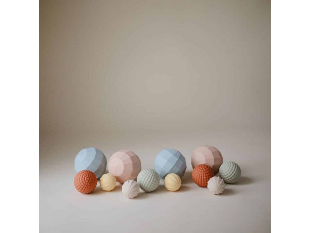 Každá silikónová guľa má inú farbu a textúru, ktorá stimuluje hmatové skúmanie a povzbudzuje deti, aby cítili, stláčali a objavovali nové vnemy. Vnorený dizajn umožňuje gule stohovať do seba, čím podporuje priestorové povedomie a koordináciu.