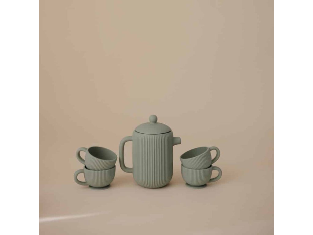 Silikónová čajová súprava od Mushie je navrhnutá pre malé rúčky a veľkú predstavivosť.