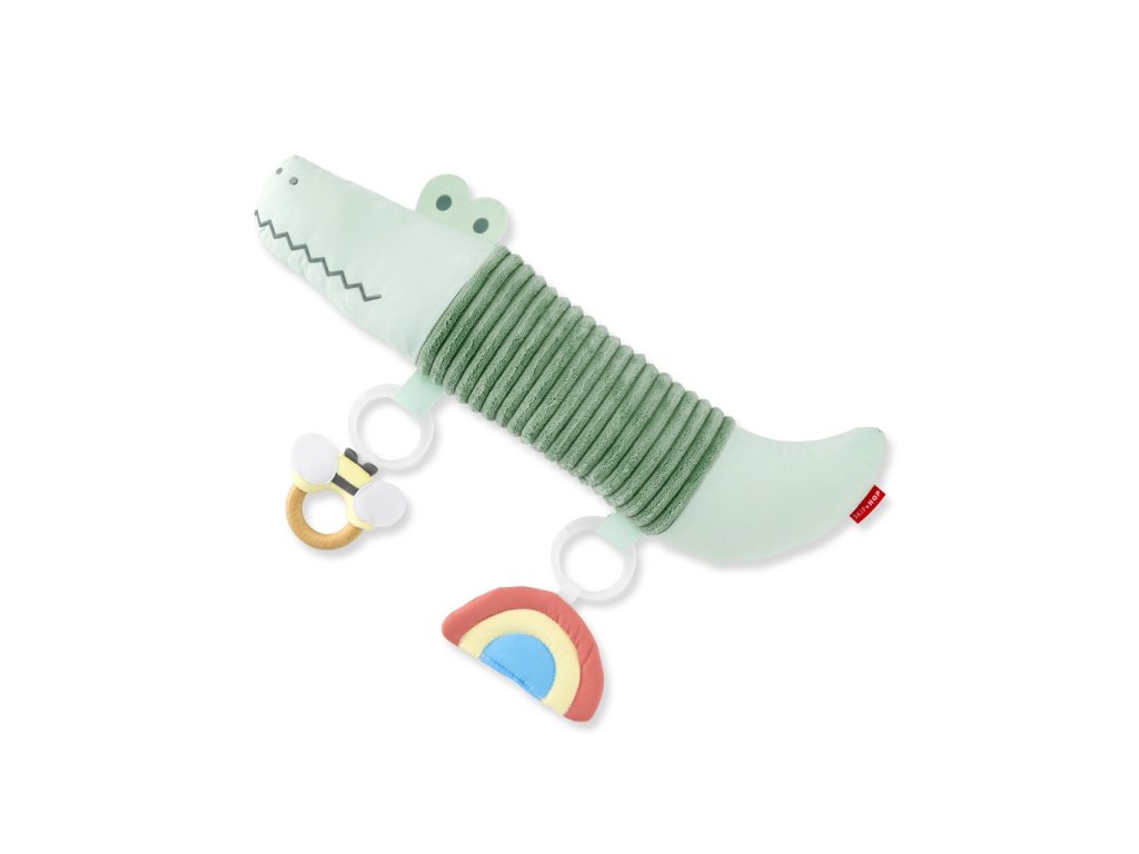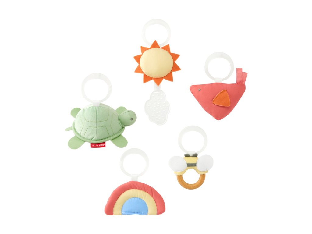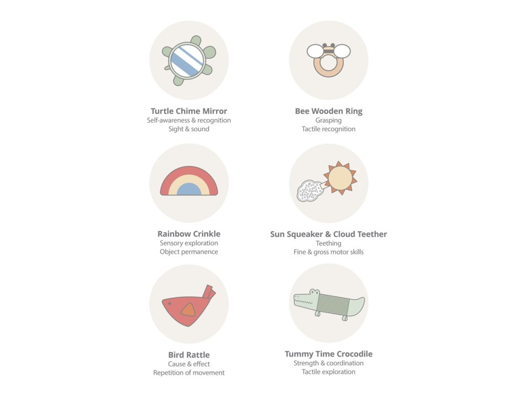 - 5 zavesených hračiek pre interaktívnu zábavu: zvoniaca korytnačka so zrkadlom na bruchu, drevená včielka s látkovým telom, vtáčik s rolničkou, šuštiaca dúha, pískacie slniečko s hryzačkou v tvare obláčika