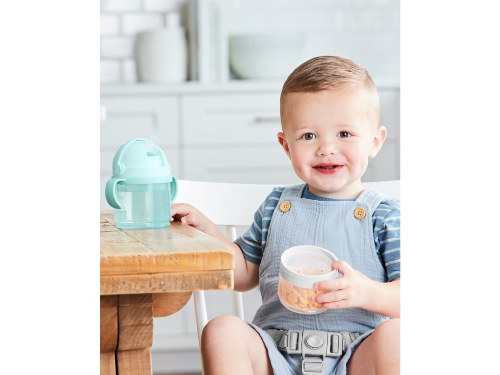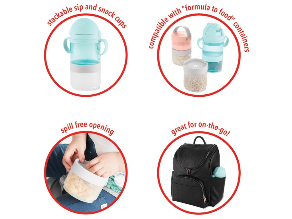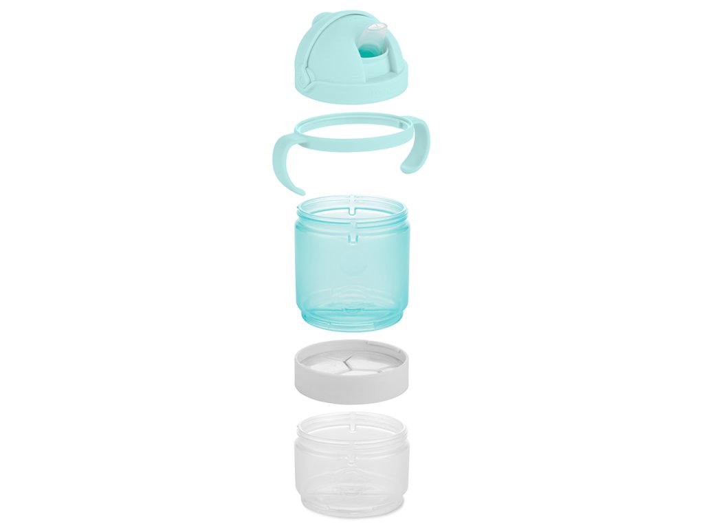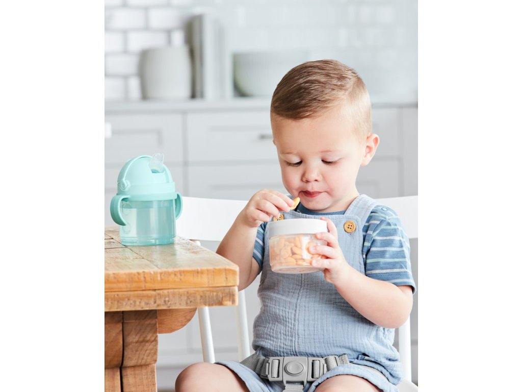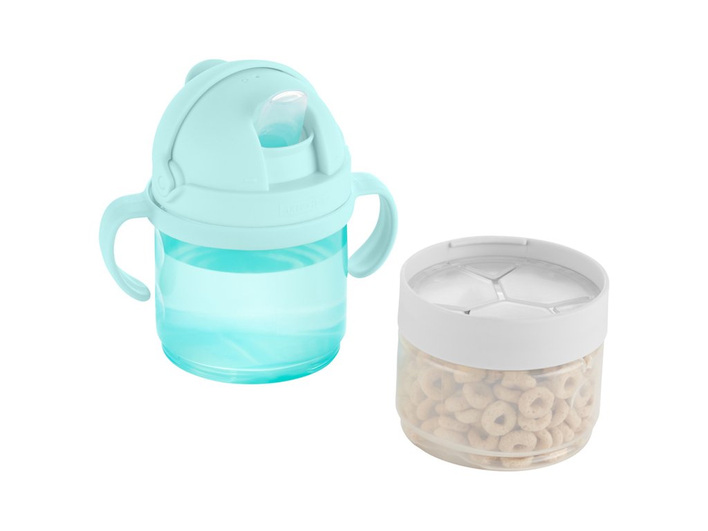 Táto praktická 5-dielna sada na jedlo a pitie pre bábätká a batoľatá má špecifický dizajn na stohovanie, čím sa prispôsobí vašim meniacim sa potrebám. Vďaka tejto sade môžu vaše detičky popíjať a maškrtiť doma aj na cestách. Vďaka dvom kompatibilne vymeniteľným otočným uzáverom/viečkam, dvom nádobám a voliteľnej rukoväti vám táto sada umožňuje používať jednotlivé komponenty samostatne alebo ich naskladať dohromady. Naplňte ich cereáliami, sušienkami, ovocím, vodou, džúsom a ďalšími obľúbenými jedlami vášho drobčeka a môžete ísť do sveta.