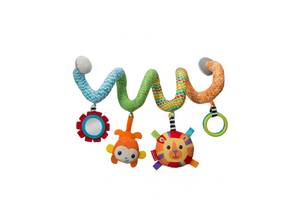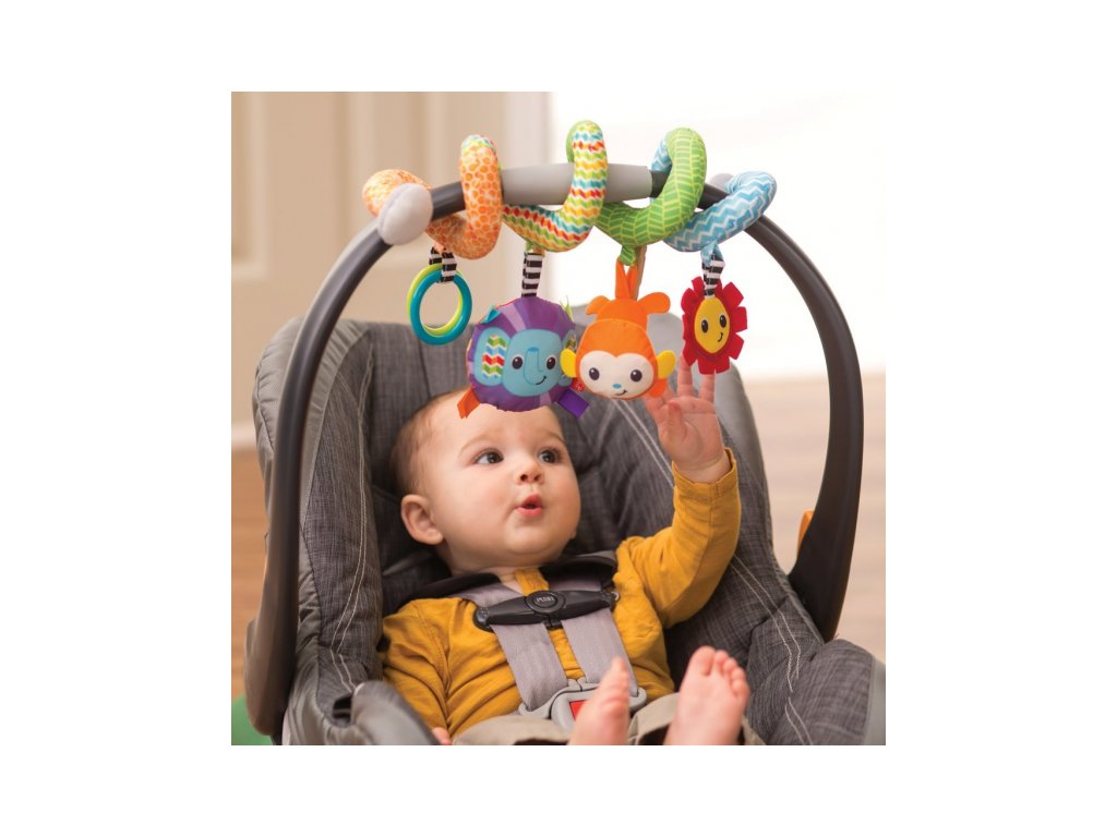 Špirálu ľahko pripevníte k madlu kočíka, autosedačky či na postieľku. Zavesené hrkajúce a šuštiaci hračky vo výrazných farbách upútajú pozornosť dieťaťa a pomáhajú rozvoju jeho zmyslov.