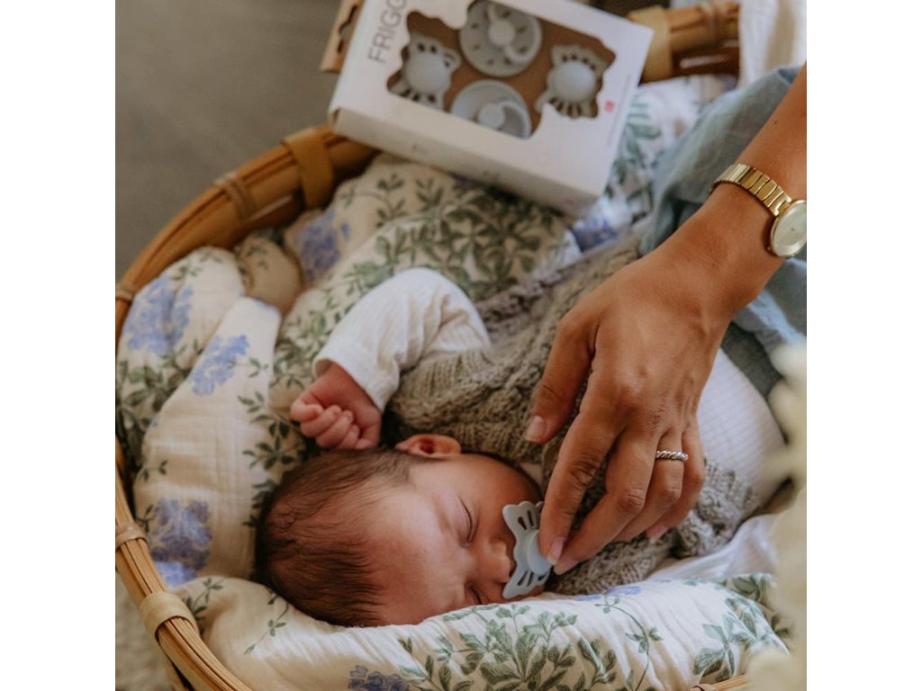 Súprava „prvý cumlík pre bábätko“ od FRIGG pozostávajúca zo 4 rôznych cumlíkov FRIGG s rôznymi materiálmi a tvarmi bradaviek dáva rodičom možnosť vyskúšať si rôzne cumlíky, aby zistili, ktorý sa ich bábätku páči najviac.