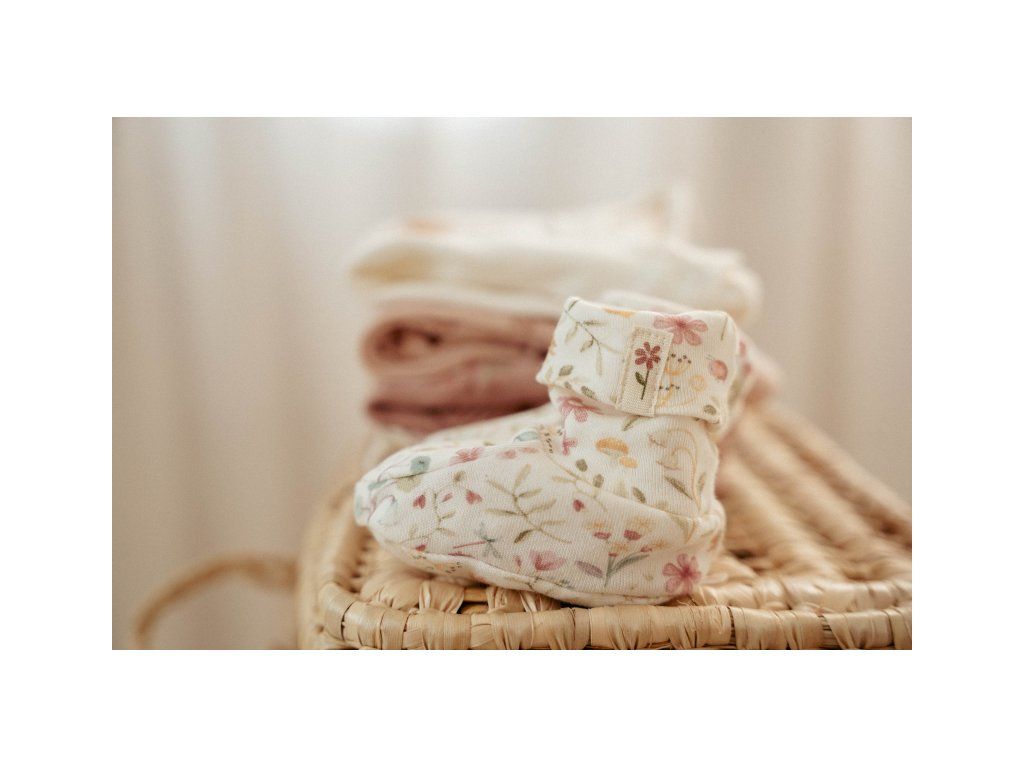 Topánočky z jemnej organickej bavlny s krásnou kvetinovou potlačou udržia nožičky vášho dieťaťa v teple a pohodlí.