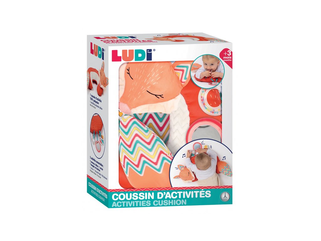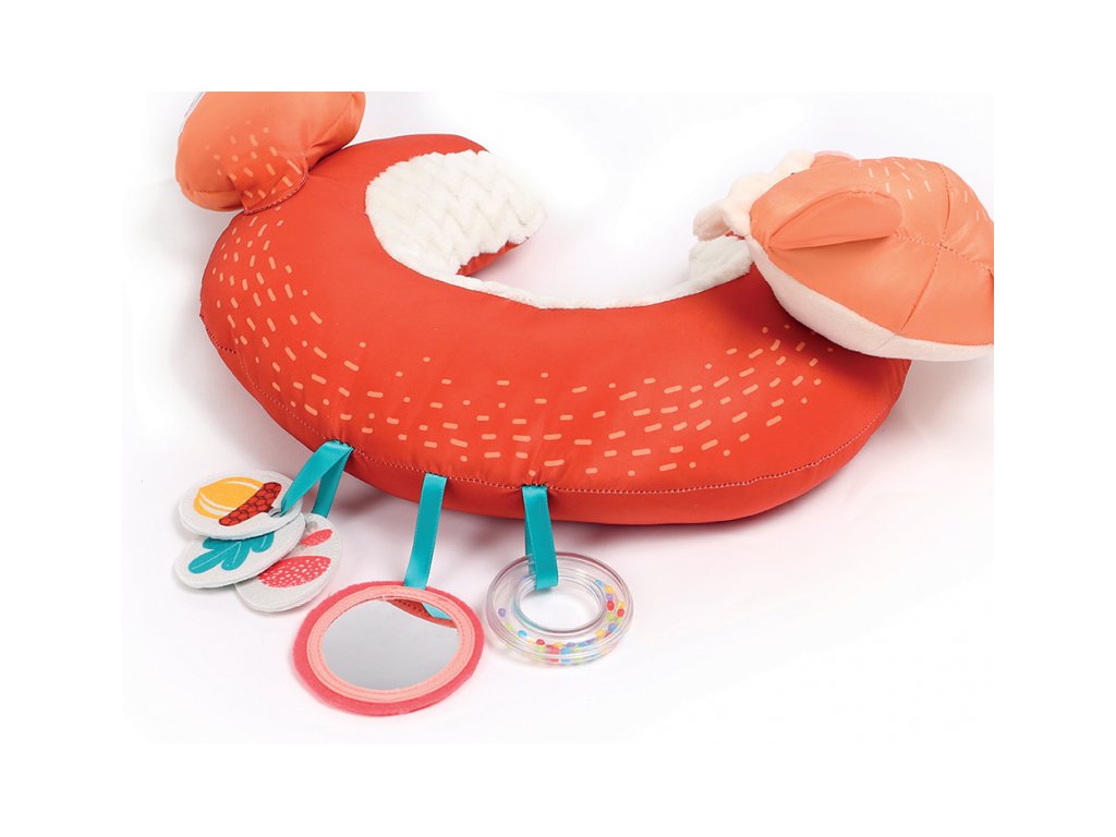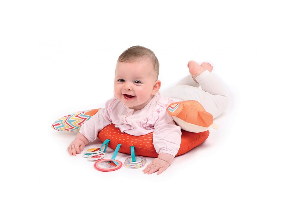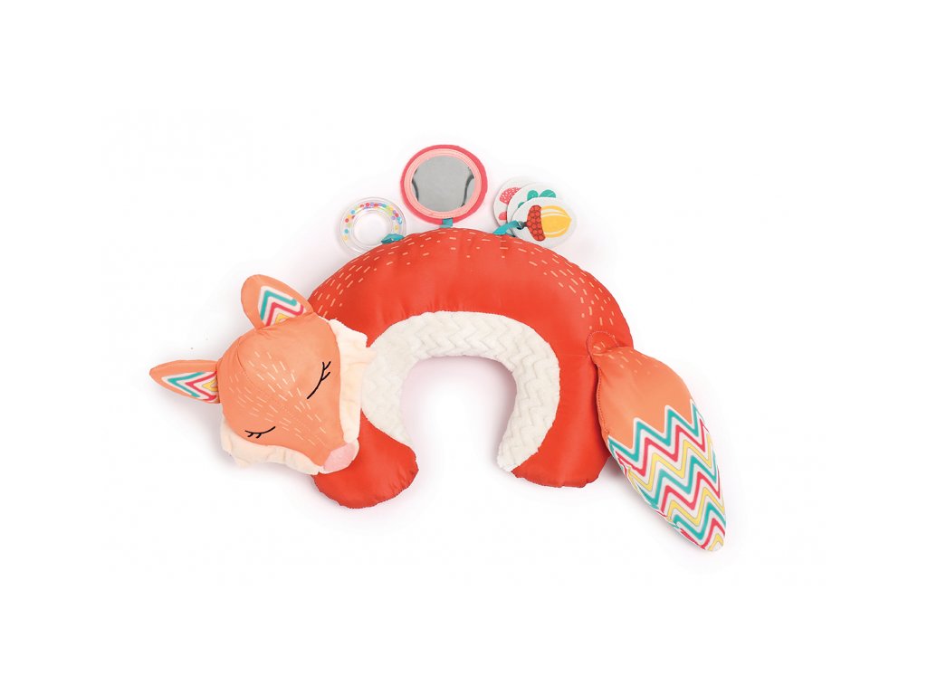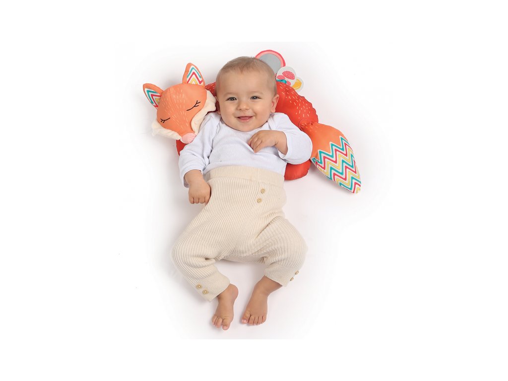 Vankúšik v podobe líšky z mäkkého, príjemného materiálu je špeciálne navrhnutý, aby podporoval hranie dieťaťa na brušku. Pozornosť dieťaťa upúta bezpečné zrkadlo, hrkálka, mini knižka s výraznými obrázkami i šuštiacou časťou.
