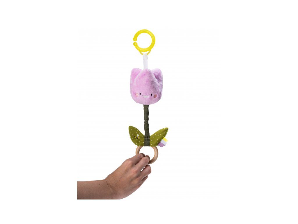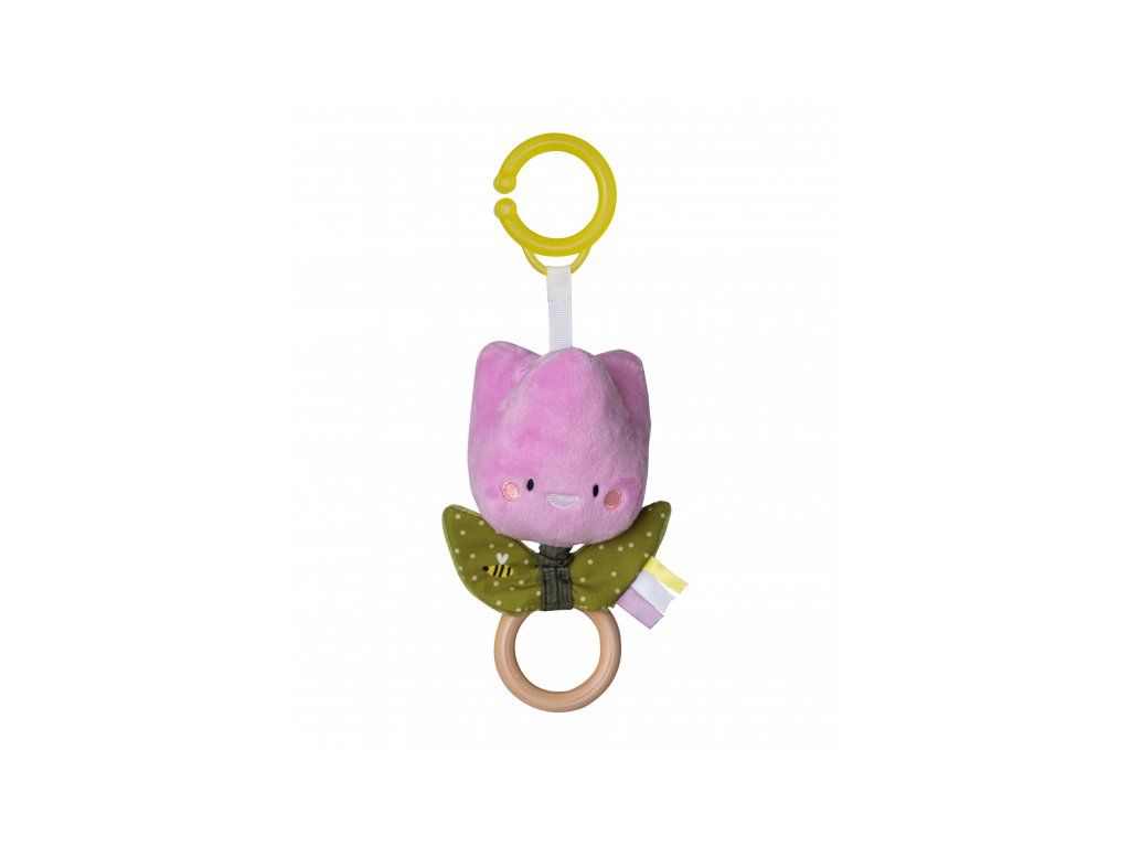 Závesná plyšová hračka v podobe usmievavého tulipánu pri pohybe hrká, po zatiahnutí za krúžok hračka vibruje. Vďaka závesnému krúžku tulipán ľahko pripevníte napr. na autosedačku či kočík.