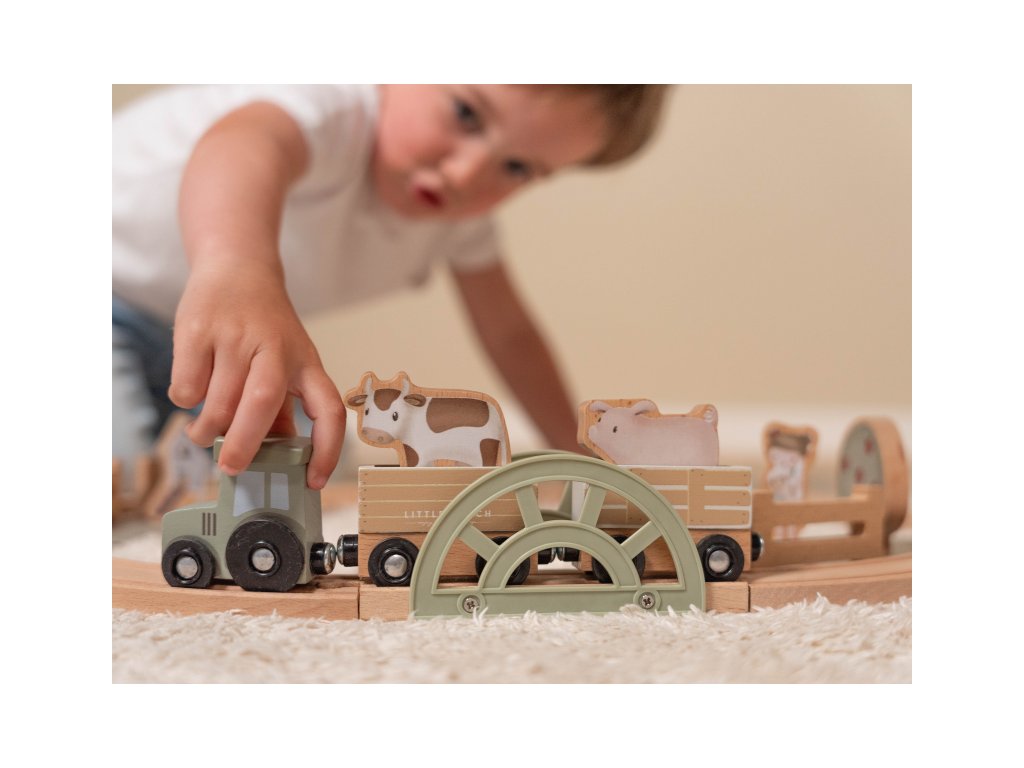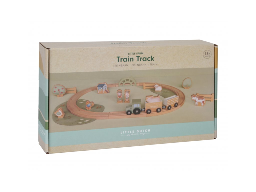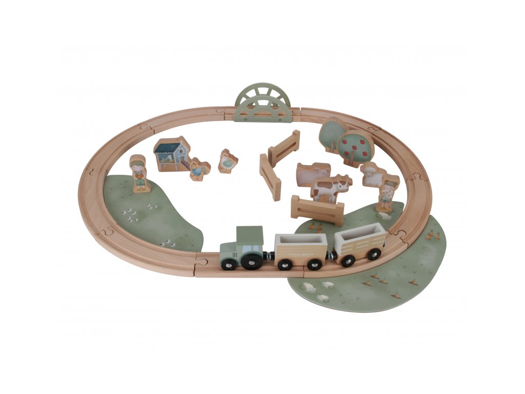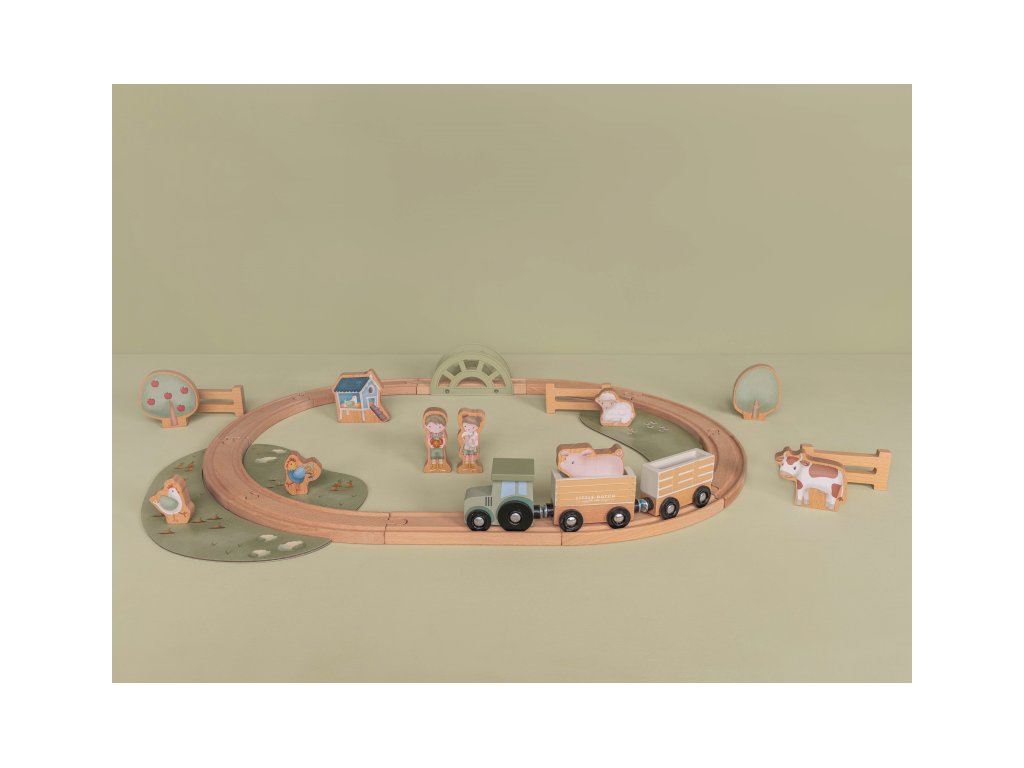 Sada obsahuje 10 dielov koľají, mašinku s dvoma vagónmi a 13 ďalších doplnkov zo života na farme. Farma, postavičky, zvieratká aj stromy sú obojstranne potlačené. Zvieratká majú veľkosť vhodnú na naloženie do vagónov, aby mohli vyraziť na výlet vlakom.