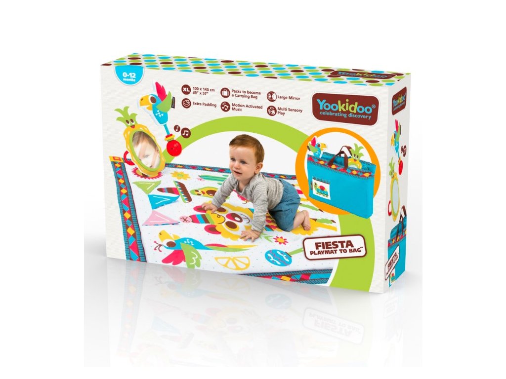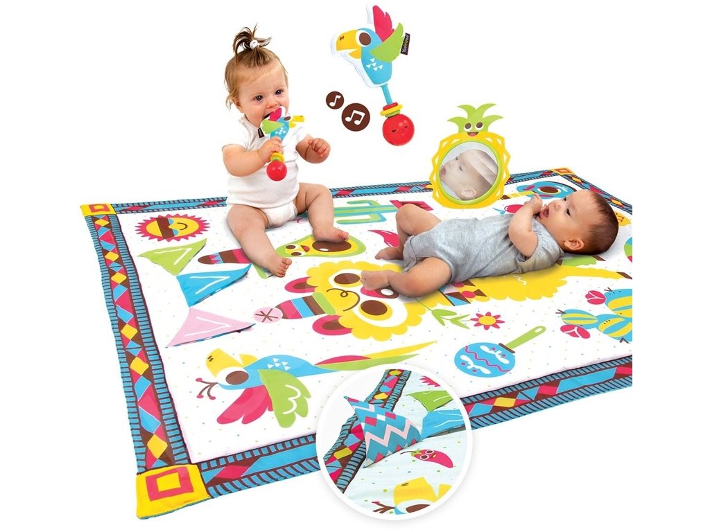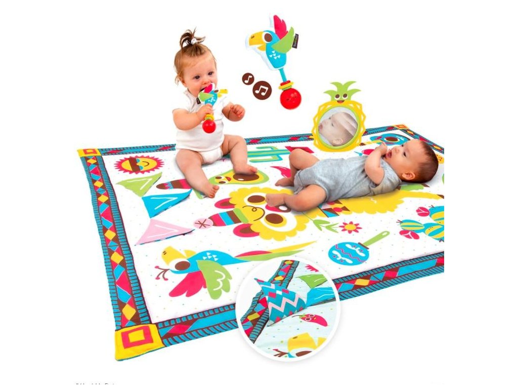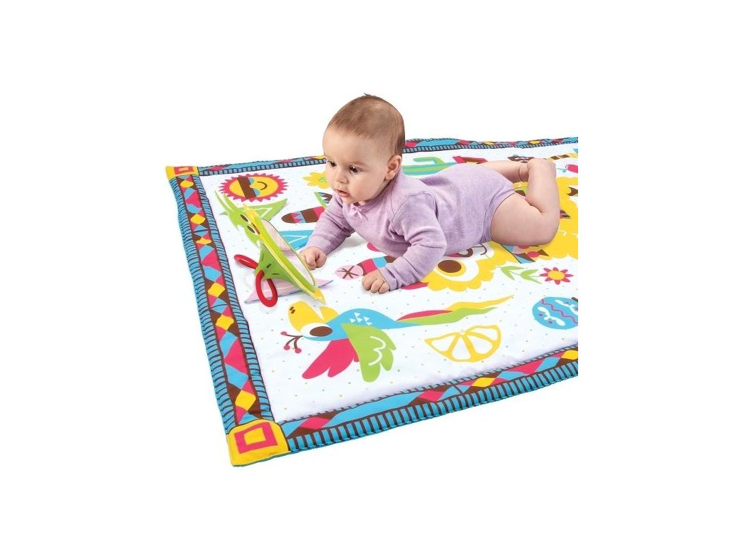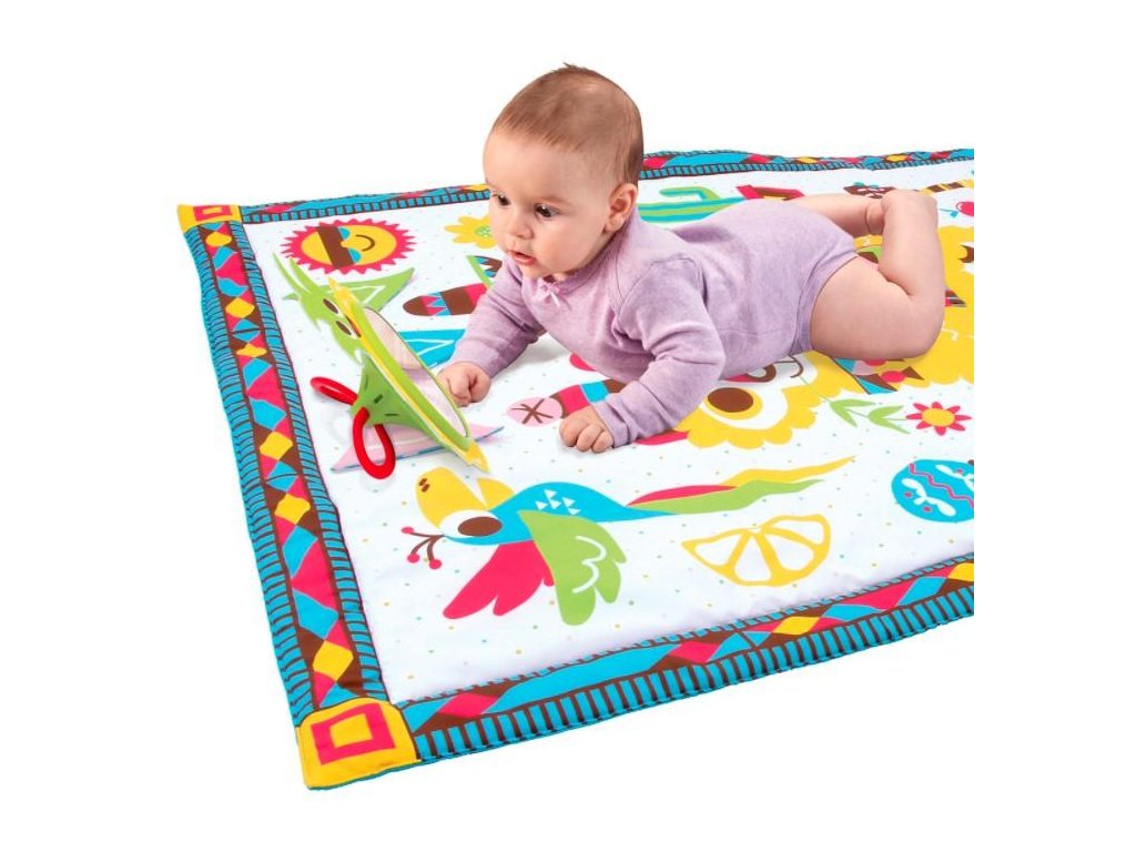 Veľká hracia deka umožňuje dieťaťu pohybovať sa, prevrátiť sa a preskúmať jeho okolie, čím sa predĺži doba hry na brušku. Ilustrácie s farebnými kontrastmi stimulujú zrak a kognitívne zručnosti. Veľké zrkadielko podporuje opakované zdvíhanie hlavičky a rozvíja svaly krku a ramien, ktoré sú dôležité pre vývoj dieťaťa. Šuštiace vlajky pod sebou ukrývajú obrázky a zároveň stimulujú hmat aj sluch. Hudobný hrkálka, ktoré po zatrasení vydáva zábavné zvuky učí dieťa vzťahu príčina-následok.